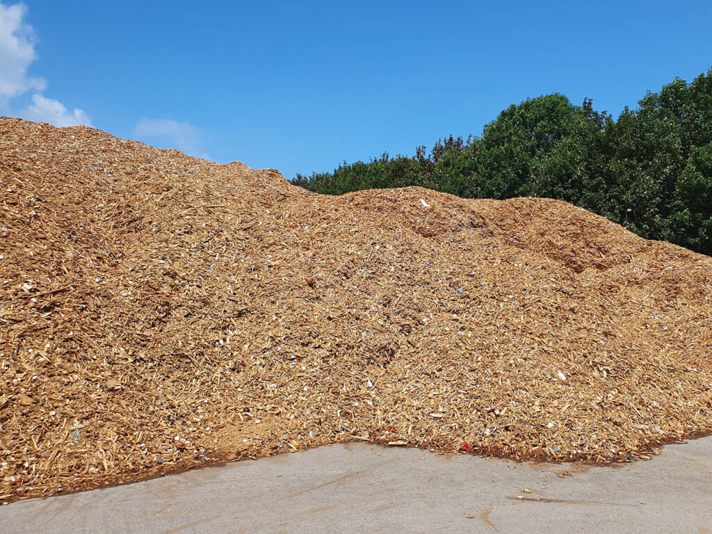 Hieronder een voorbeeld van afval hout en het resultaat wanneer het hout is verwerkt tot houtsnippers.